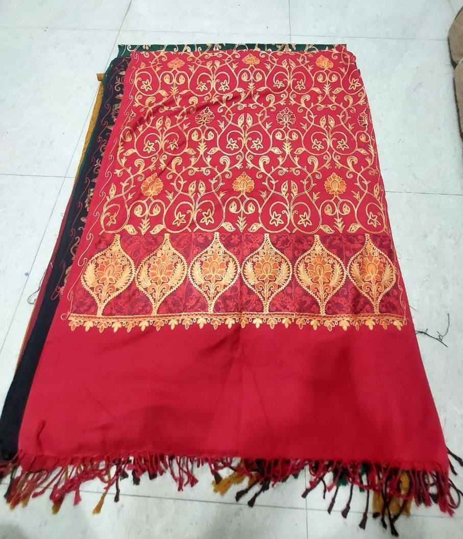 We offer a stunning Ladies Red Embroidered Kashmiri Pashmina Shawl, meticulously crafted with impeccable finish using machine-made technics. Made from luxurious Pashmina material, this shawl showcases exquisite embroidery typical of Kashmiri style. Originating from India, this shawl features a vibrant red base color, measuring approximately 80 inches in length and 28 inches in width. Lightweight at around 200 grams, it is perfect for adding elegance and warmth to any outfit. Ideal for manufacturers and suppliers seeking high-quality, authentic Kashmiri shawls to delight their customers.